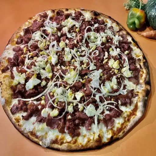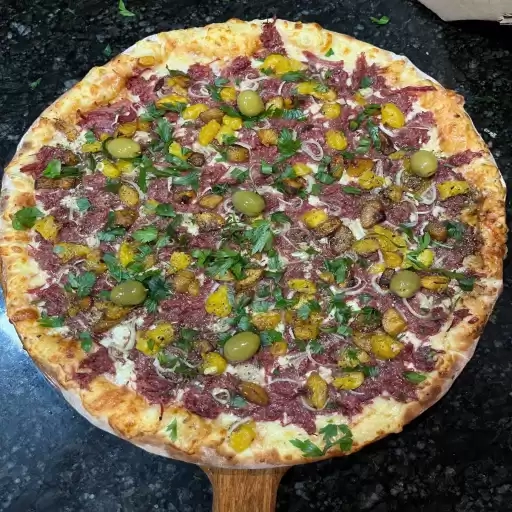 MASSA FINA, MUSSARELA, CARNE SECA, CATUPIRY ORIGINAL, GORGONZOLO, SALSINHA, AZEITONA E OREGANO