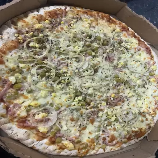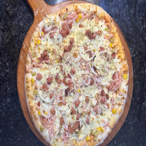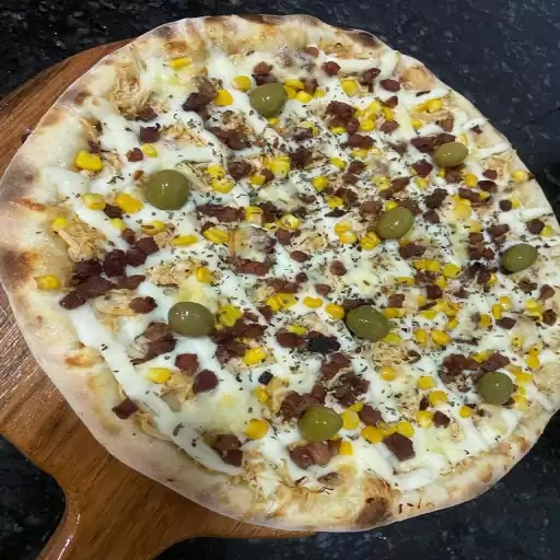 MASSA FINA, MUSSARELA, FRANGO, BACON, CATUPIRY ORIGINAL, MILHO, PROVOLONE, AZEITONA E OREGANO