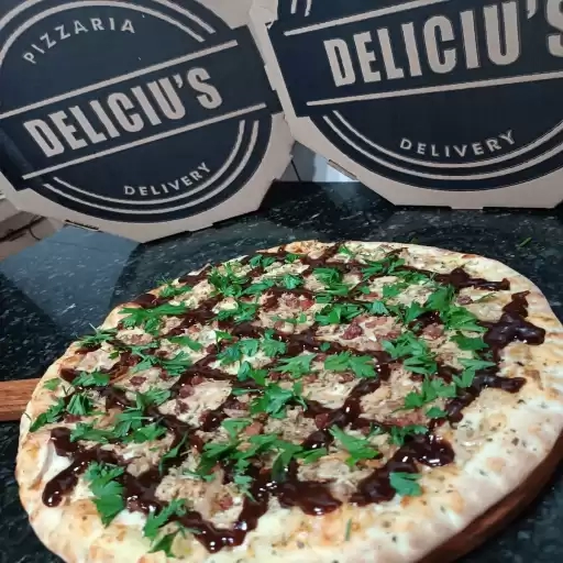 MASSA FINA, MUSSARELA, PERNIL SUINO DESFIADO, BACON, MOLHO BARBECUE, SALSINHA E OREGANO