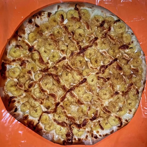 Massa fina, mussarela, banana, chocolate branco e canela.