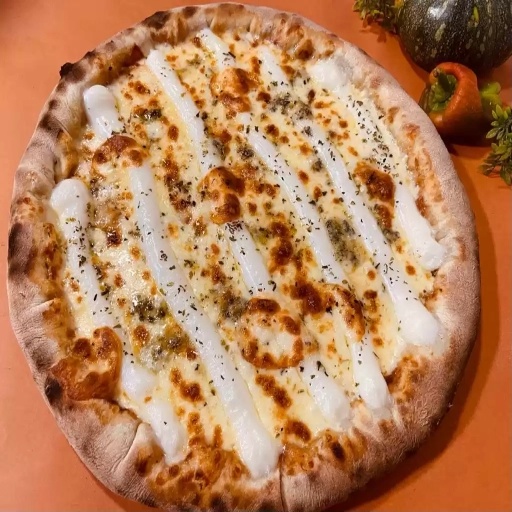 MASSA FINA, MUSSARELA, CATUPIRY ORIGINAL, GORGONZOLA, PROVOLONE, BACON, TOMATE SECO, RUCULA E OREGANO