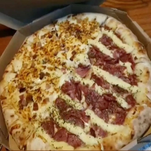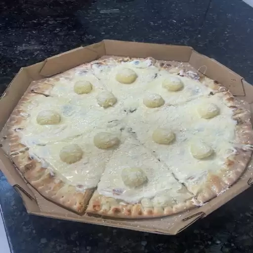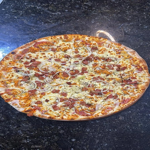 MASSA FINA, MOLHO, MUSARELA, BACON, PROVOLONE, GORGONZOLA, CATUPIRY ORIGINAL E PARMESÃO RALADO